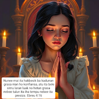 Tan ne'e, tanba ita hatene katak Kristu komprende ita-nia frakeza sira no sente ona ita-nia terus, ita bele halo orasaun. Kuandu ita husu Maromak nia laran-sadi'a, grasa, ajuda, ka perdua, ita bele iha konfiansa katak ita sei hetan (Ebreu 3:6). La iha ema ida mak bele komprende di'ak liu ita-nia terus liu fali Jesus, tan ne'e mak so Jesus de'it mak bele sai ita-nia Amlulik Boot no mós bele kasu ita-nia sala (Ebreu 2: 18).